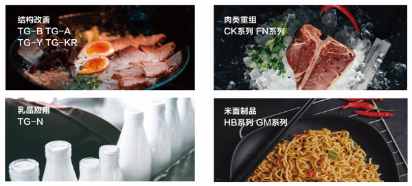 优质的TG酶具备天然安全、稳定性强、粘合力强、酸碱适宜度广等特点,可广泛应用于肉制品、乳制品、面制品、水产品和豆制品等产品中。